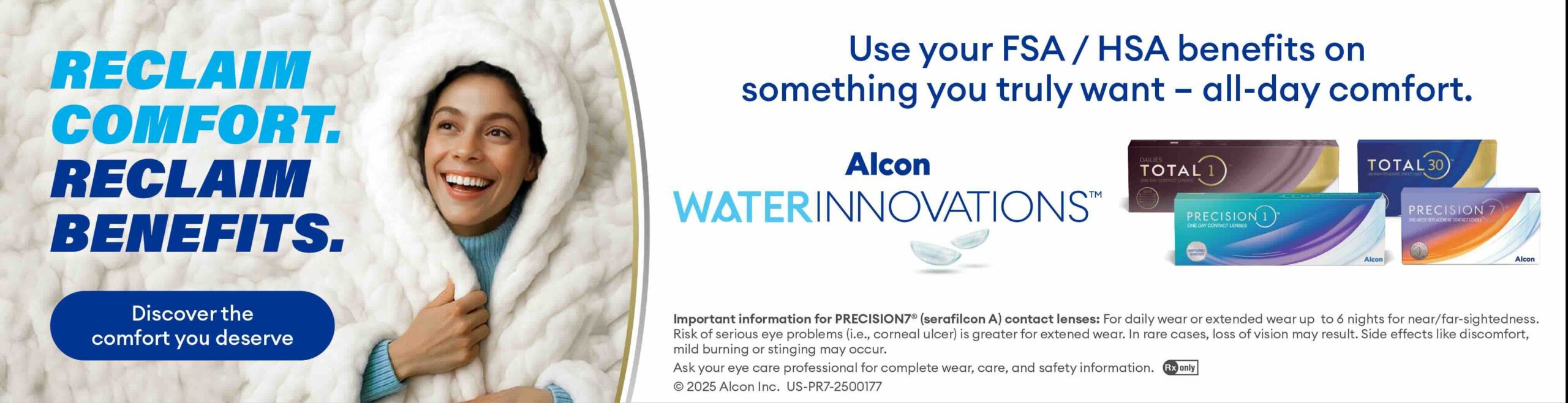 Proclear by CooperVision are a line of daily-disposable contact lenses with options available for nearly every corrective lens prescription need, including options for astigmatism. They feature Phosphorylcholine, a material that attracts water and encourages healthy eye hydration.